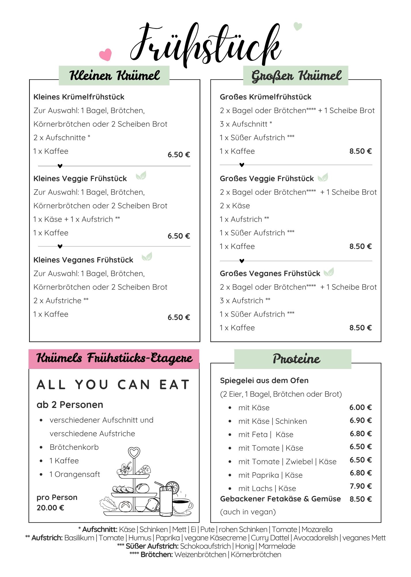 2 x Bagel, Brötchen + 1 Scheibe Brot 2 x Käse 1 x Aufstrich 1 x Süßer Aufstrich 1 x Kaffee